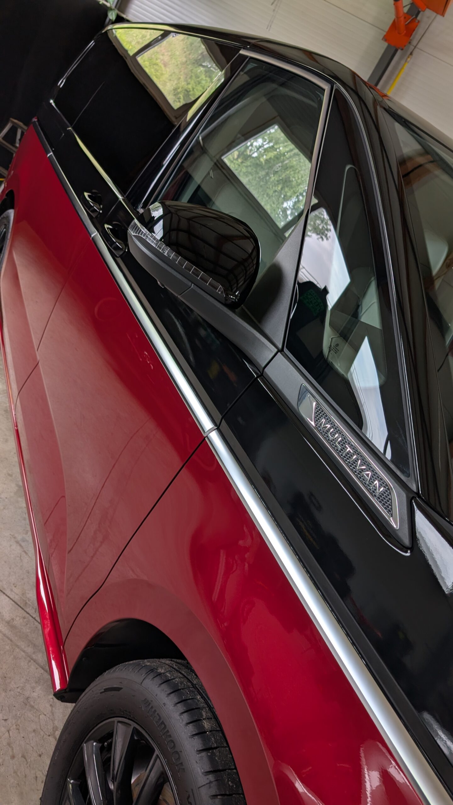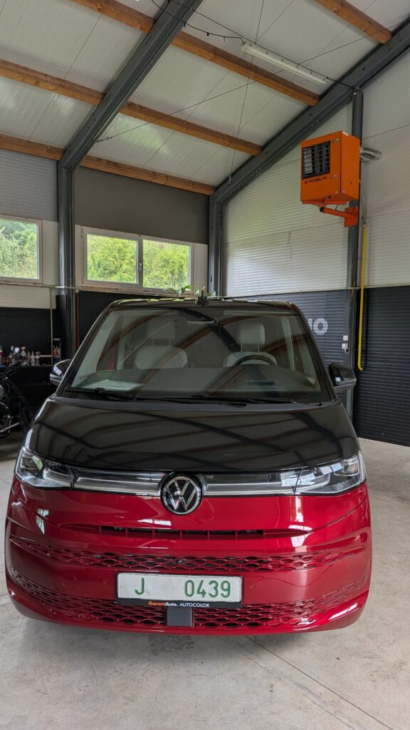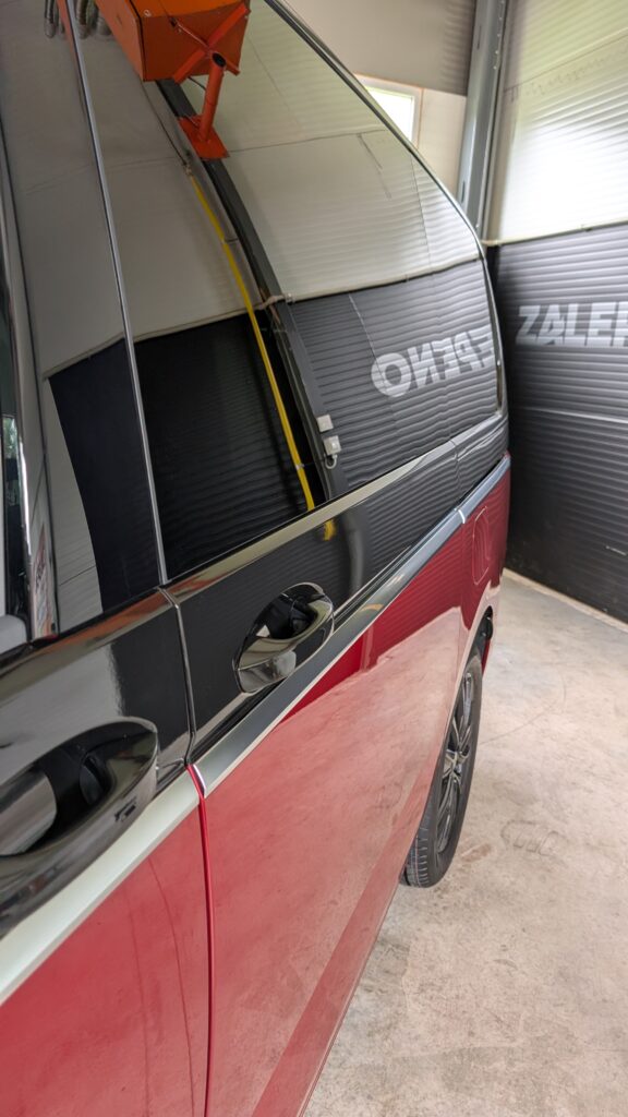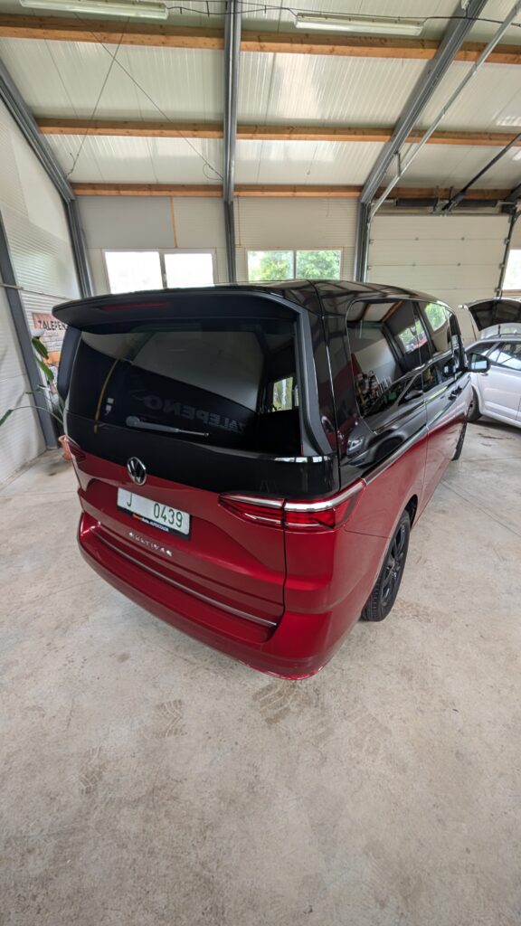 Na VW Multivan T7 jsme aplikovali designový polep celé horní poloviny vozu do černé lesklé fólie, čímž vznikl výrazný a zároveň elegantní dvoubarevný design.